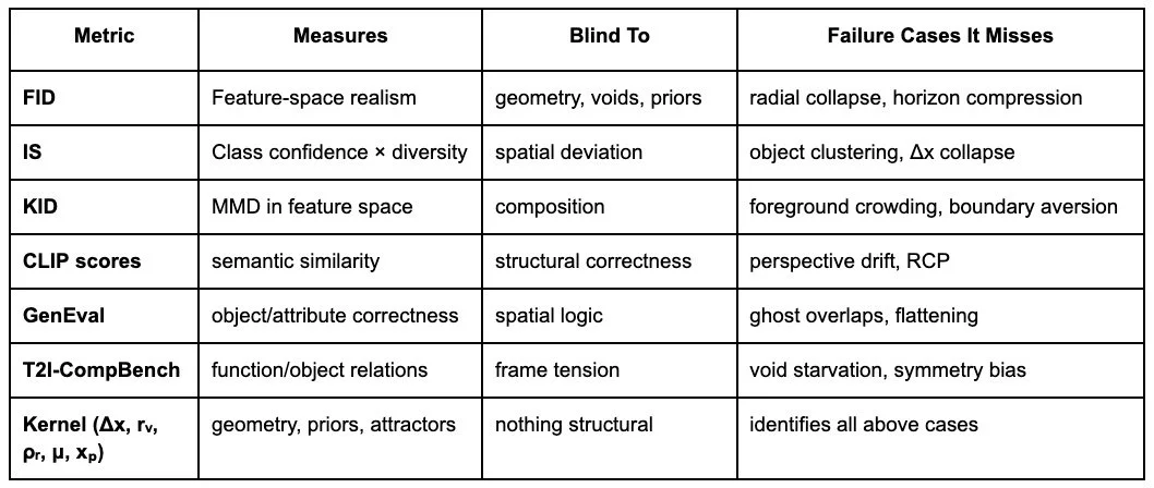 What Existing Metrics Reward vs What They Miss vs What the Kernel Adds