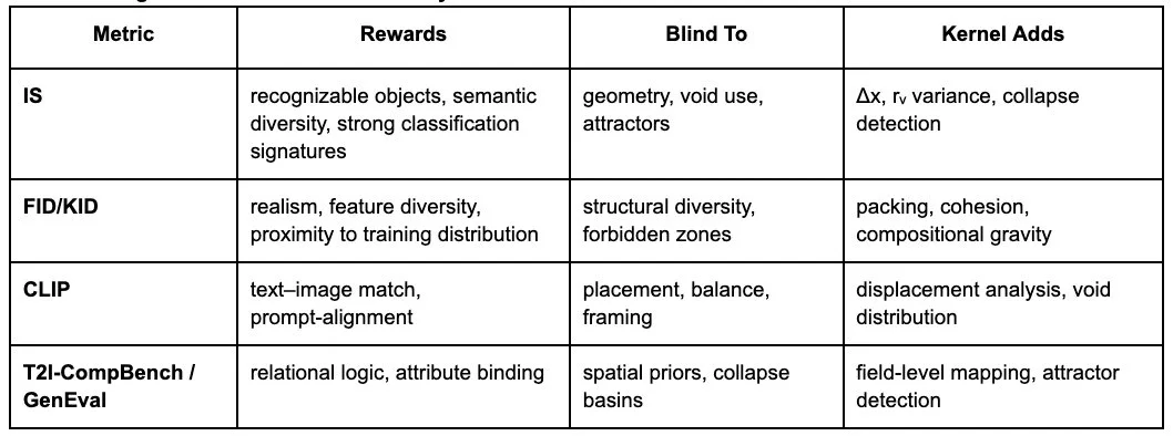 This construct introduces a kernel-based geometric framework for measuring the spatial priors image models default to, using a geometric kernel, Δx (placement offset), rᵥ (void ratio), ρᵣ (packing density), μ (cohesion), xₚ (peripheral pull), a compact field that exposes compositional bias and collapse behavior in image models. This kernel augments existing metrics rather than replacing them: it measures the spatial degrees of freedom a model actually uses, and reveals inductive priors (like Radial Collapse Prior) that semantic metrics cannot detect.