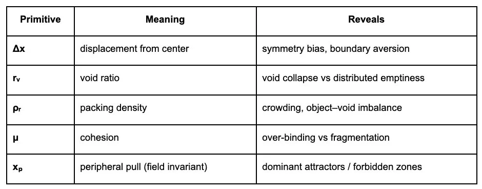 Degree to which visually distinct masses fuse under uncertainty.xₚ — Peripheral pull: Field invariant computed as: xₚ = f(Δx, rᵥ, ρᵣ, μ), Field invariant describing net pull toward boundaries or center. Used to detect directional bias and collapse vectors (xₚ is not a primitive; it emerges from the primitives).