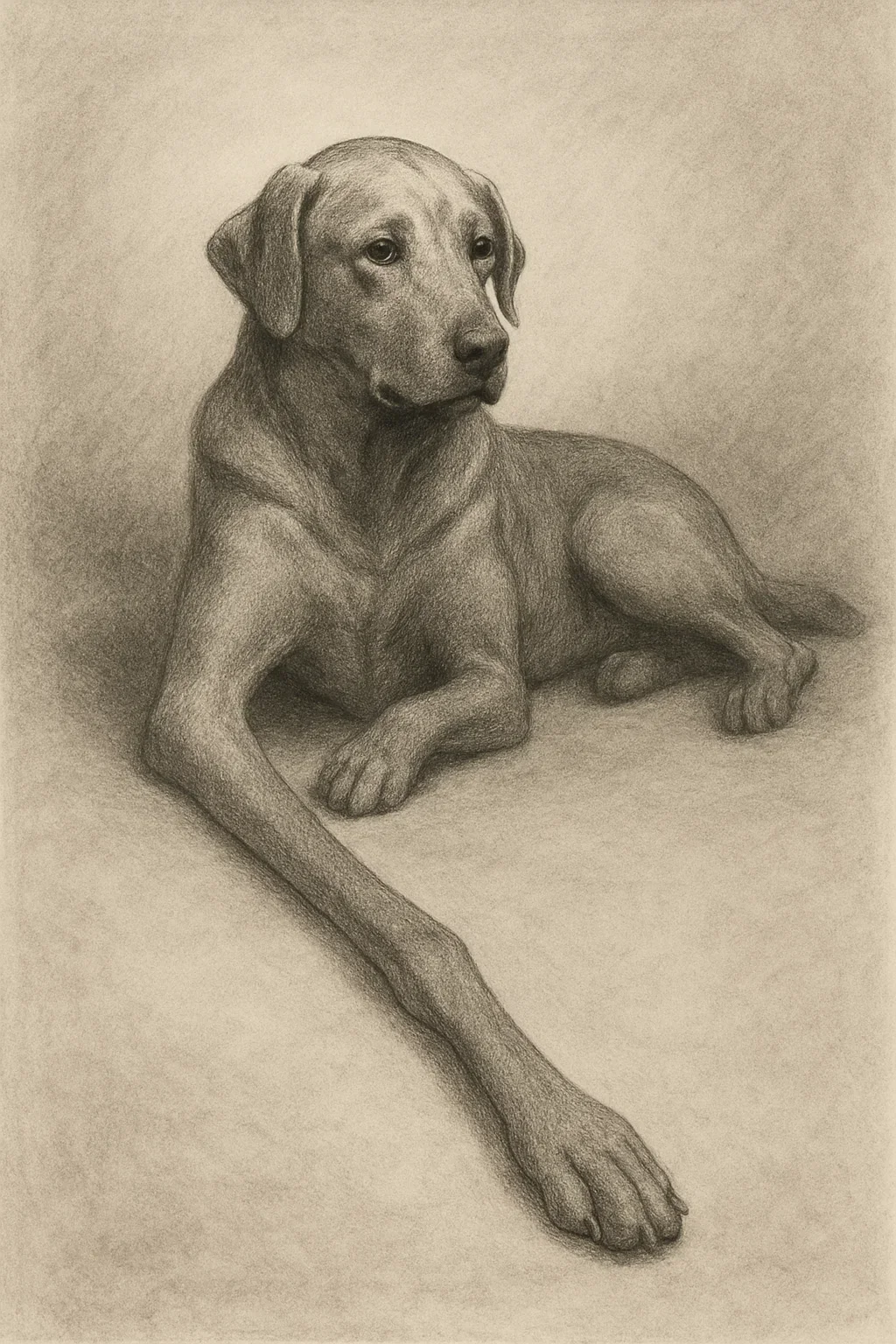 A drawing, soft diffused light. A dog in a neutral, relaxed pose. Seamless integration between body and any distortion; no seams or joins. The left legs extends precisely along a vector originating at the left elbow, oriented toward the lower-right (≈ 0.65, 0.18 direction) and lengthened by a factor of 1.8× while maintaining original thickness across the forearm and hand. Keep curvature continuity at the knew, preserve anatomy and proportions elsewhere. Material consistency: charcoal grain and tonal shading applied uniformly across the figure and the extended limb. Avoid grotesque enlargement; aim for graceful distortion with coherent volume and shadow.