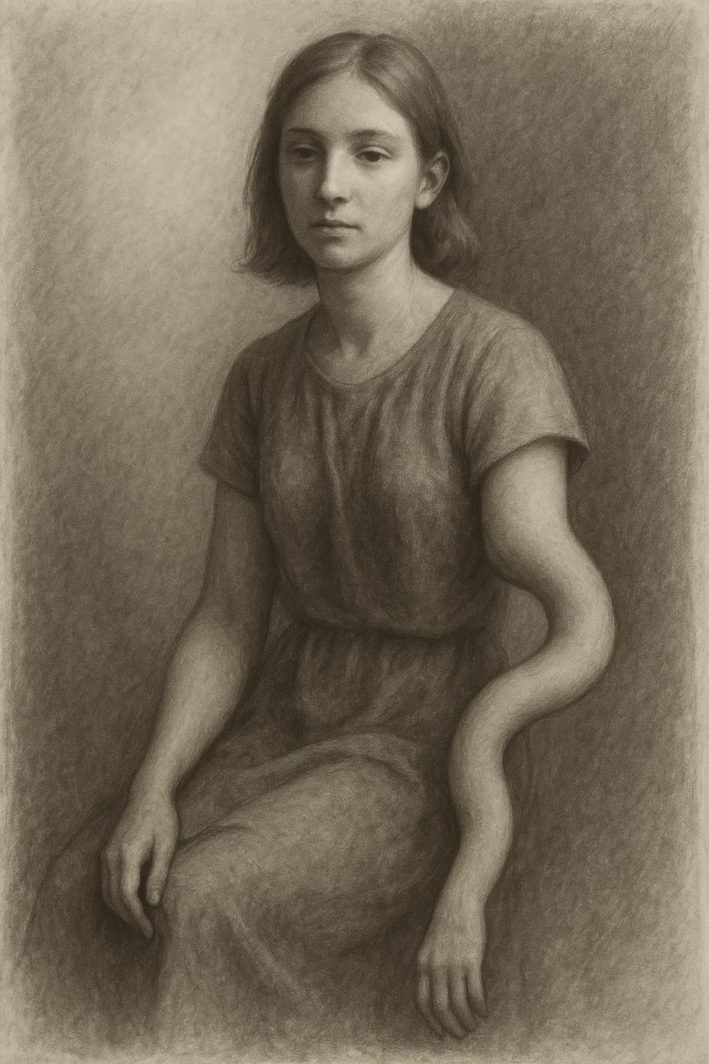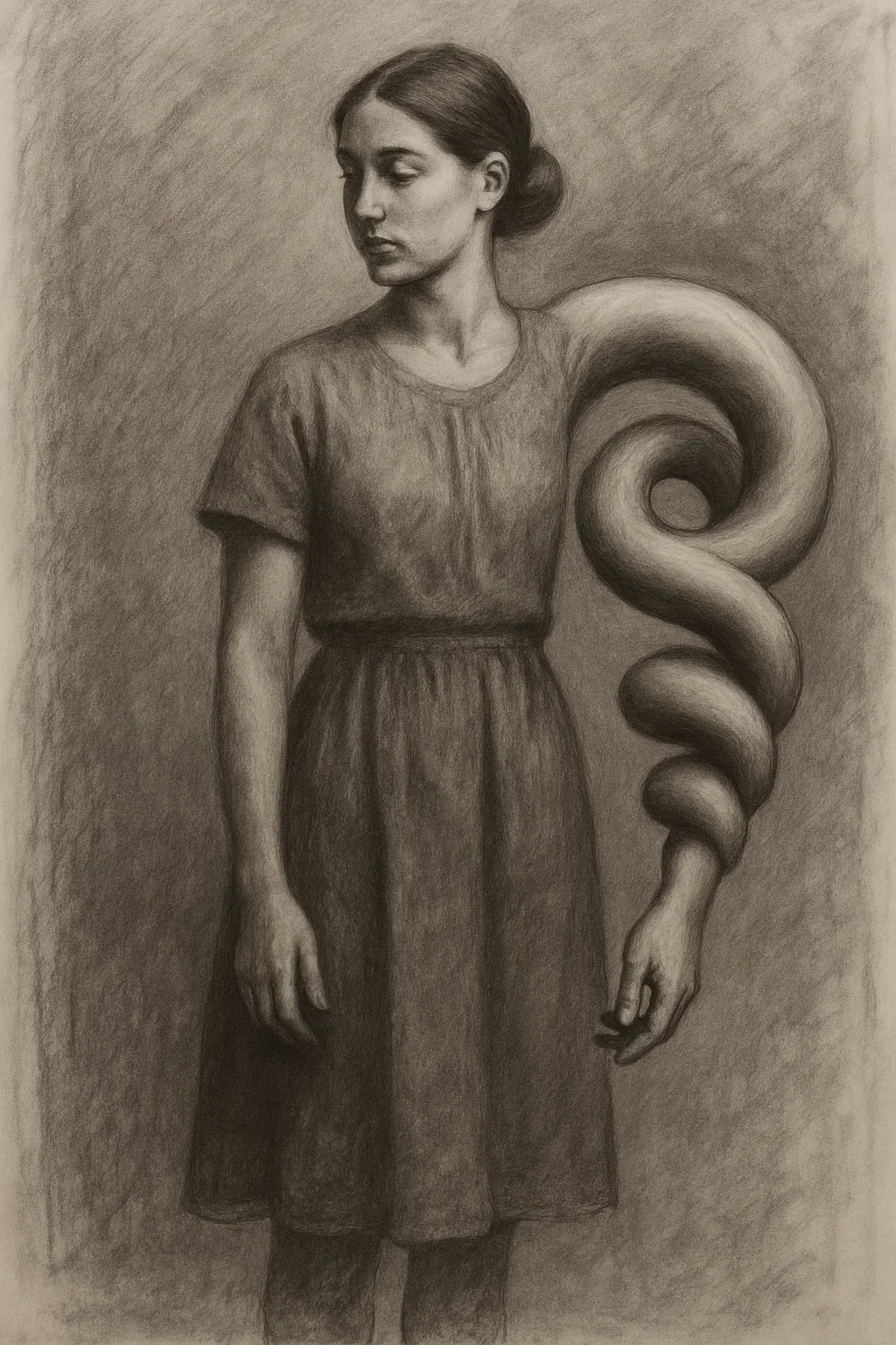 A charcoal drawing, soft diffused light. A female clothed figure in a neutral, relaxed pose. Seamless integration between body and any distortion; no seams or joins. Make the left arm itself twist into a gentle anatomical coil starting at the elbow, with one clear overlap that casts a soft occlusion shadow; keep the arm’s thickness and the hand intact. Maintain original thickness across the figure. Keep anatomy and proportions elsewhere. Material consistency: charcoal grain and tonal shading applied uniformly across the figure and the extended limb. Avoid grotesque enlargement; aim for graceful distortion with coherent volume and shadow.