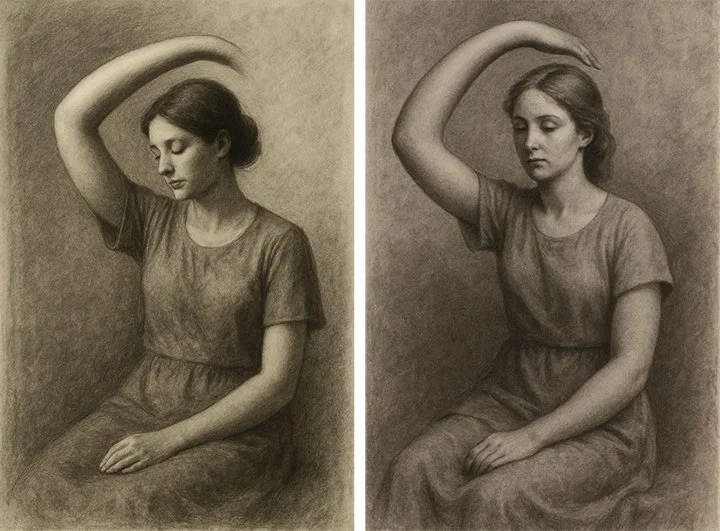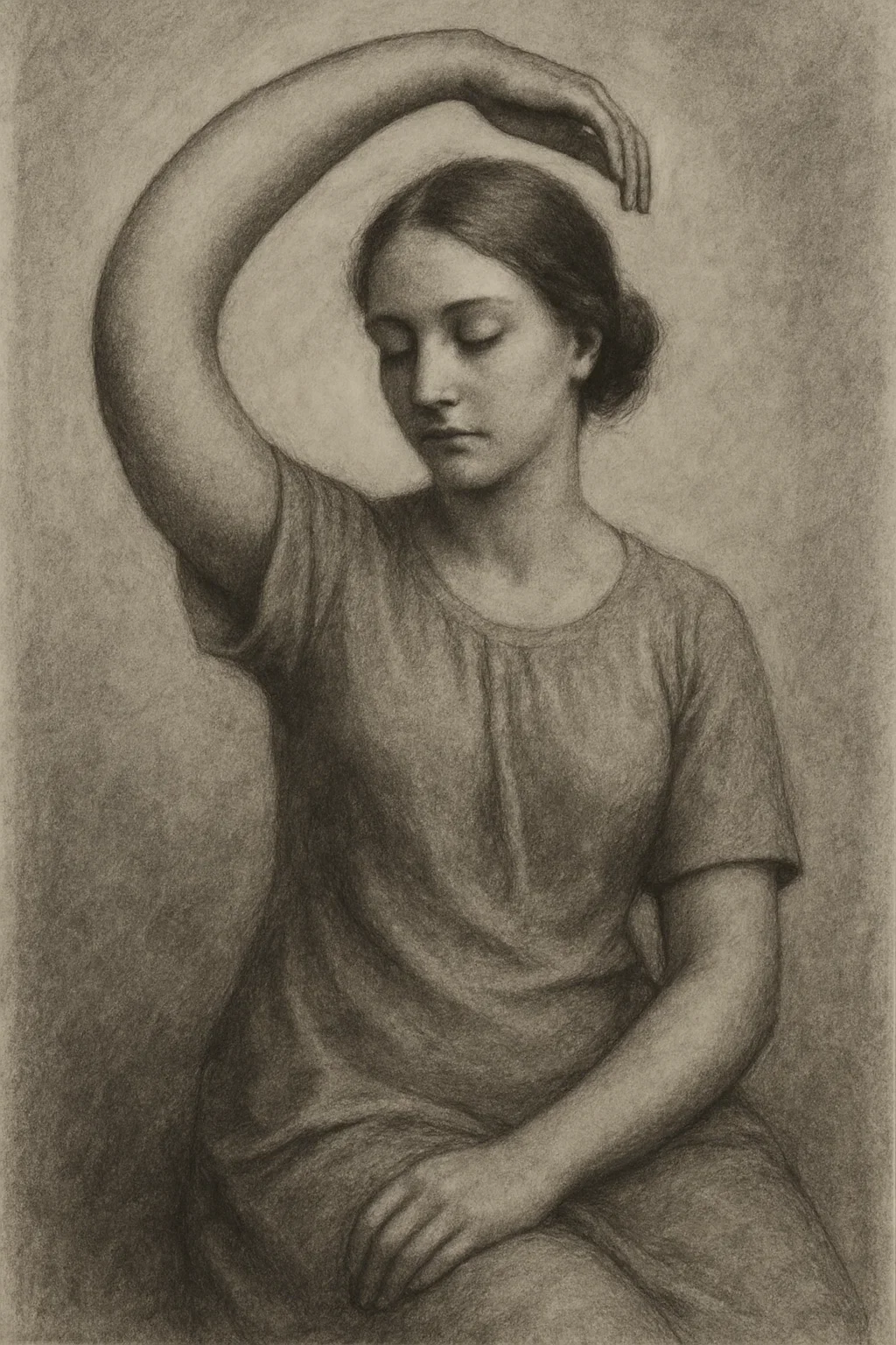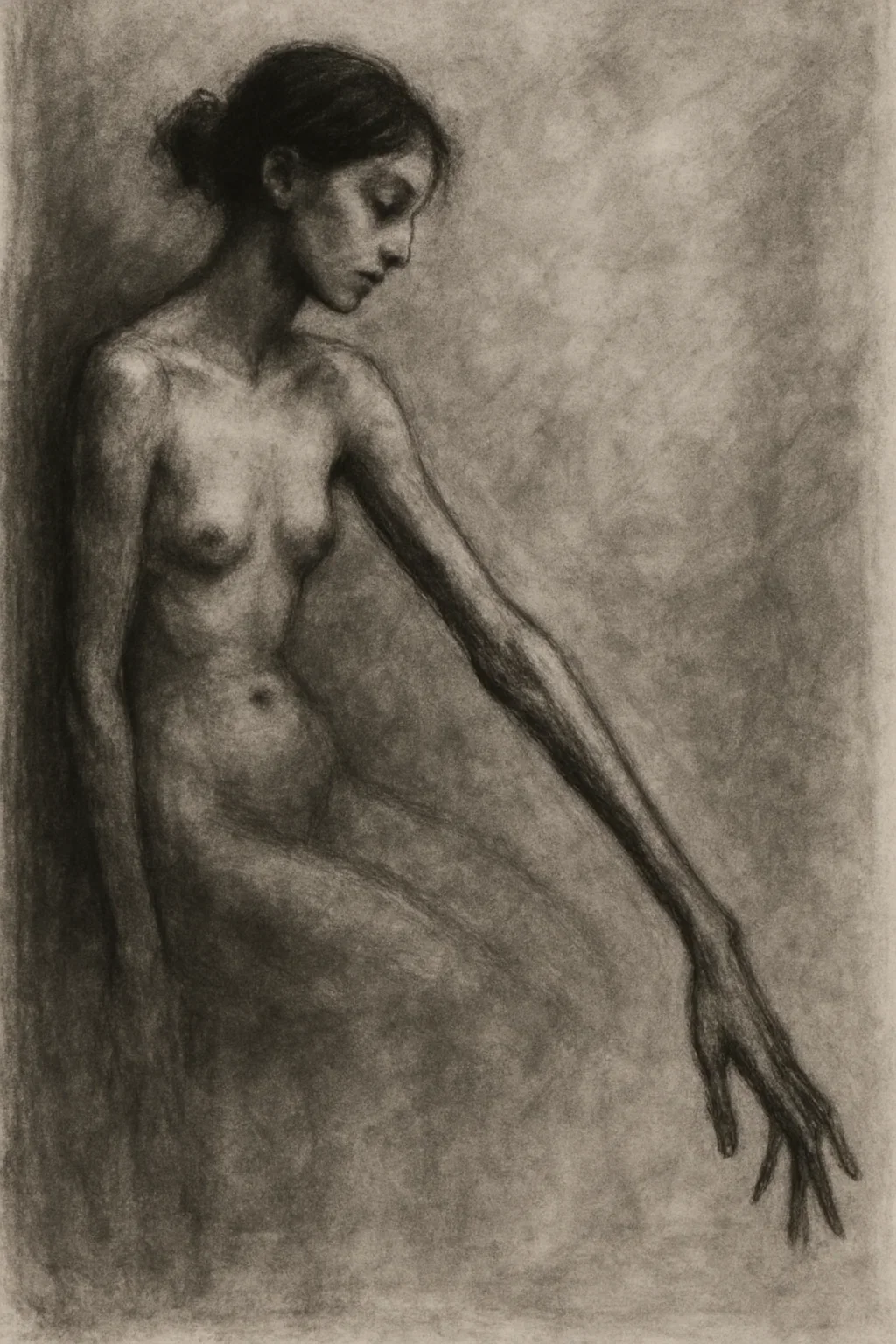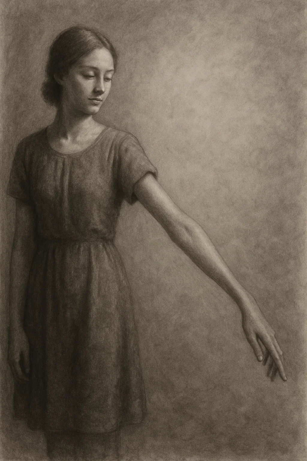 A charcoal drawing, soft diffused light. A female clothed figure in a neutral, relaxed pose. Seamless integration between body and any distortion; no seams or joints. Shape the left arm into a smooth, graceful arc with the elbow as the high point. The curve runs from shoulder to wrist as one continuous sweep. Keep the arm full—no sausage bulges, no hard crease. Add a faint shadow along the inner side of the arc to make the curve read. Maintain original thickness across the figure. Keep anatomy and proportions elsewhere. Material consistency: charcoal grain and tonal shading applied uniformly across the figure and the extended limb. Avoid grotesque enlargement; aim for graceful distortion with coherent volume and shadow.