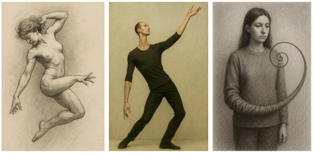 Creating controlled, graceful anatomical distortions in AI-generated images is genuinely difficult. Most distortion work relies on accidental latent space artifacts or post-processing or are just coherently applied across multiple factors (such as all limbs) of the image so AI can “understandably” generate that fits within the defaults. Getting AI systems to generate purposeful and isolated anatomical impossibilities - like a spiraling arm that maintains anatomical coherence - during initial generation is uncharted territory and can be difficult to achieve.