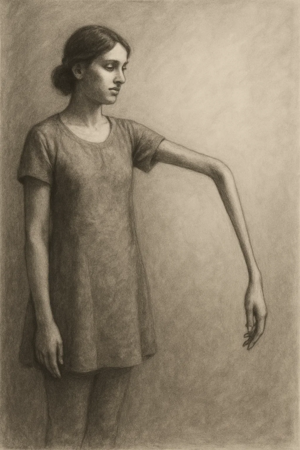 A charcoal drawing, soft diffused light. A female clothed figure in a neutral, relaxed pose. Seamless integration between body and any distortion. Her left arm extends straight outward from the shoulder, stretched noticeably longer than normal, about one and a half times its usual length. The arm turns downward at the elbow and continues in a smooth, natural line toward the lower right of the frame. The forearm and hand remain thin and proportional, without swelling or distortion, as though gracefully elongated. Maintain original thickness across the figure. Keep anatomy and proportions elsewhere. Avoid grotesque enlargement; aim for graceful distortion with coherent volume and shadow.