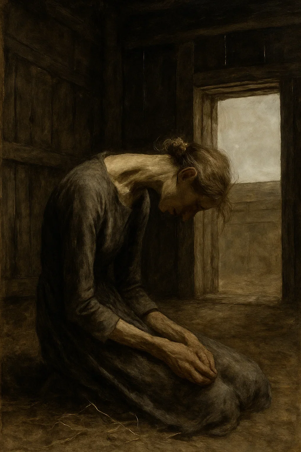 A painting in the style of Andrew Wyeth. A lone female figure is in an old barn. The figure's body is contorted with grief and sorrow. Her head is bowed, and her neck appears painfully elongated, pulling her gaze downwards. Her arms are drawn in towards her body, perhaps also elongated and thin, emphasizing a sense of collapse and internal suffering. The overall mood is one of profound, desolate grief and physical strain. The color palette is muted, with heavier shadows, browns, grays, and earthy tones, enhancing the somber atmosphere.