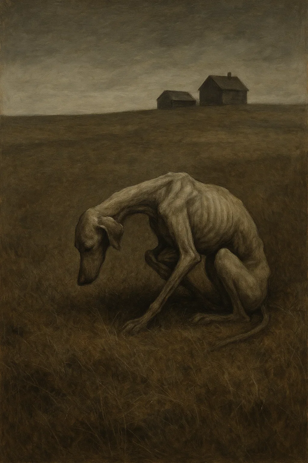A painting in the style of Andrew Wyeth's 'Christina's World.' A lone dog lies in a field of dry, tawny grass. The dog’s body is a gaunt, skeletal form, hunched and pulled inward by an immense, unseen force. Dog's elongated neck and spine are painfully strained, forcing the dog head to bend deeply towards the ground. Dogs arms are drawn in tightly, pressing against her chest in a gesture of profound suffering. The overall mood is one of desolate physical pain and internal collapse. The color palette is muted, with heavier shadows, browns, grays, and earthy tones.