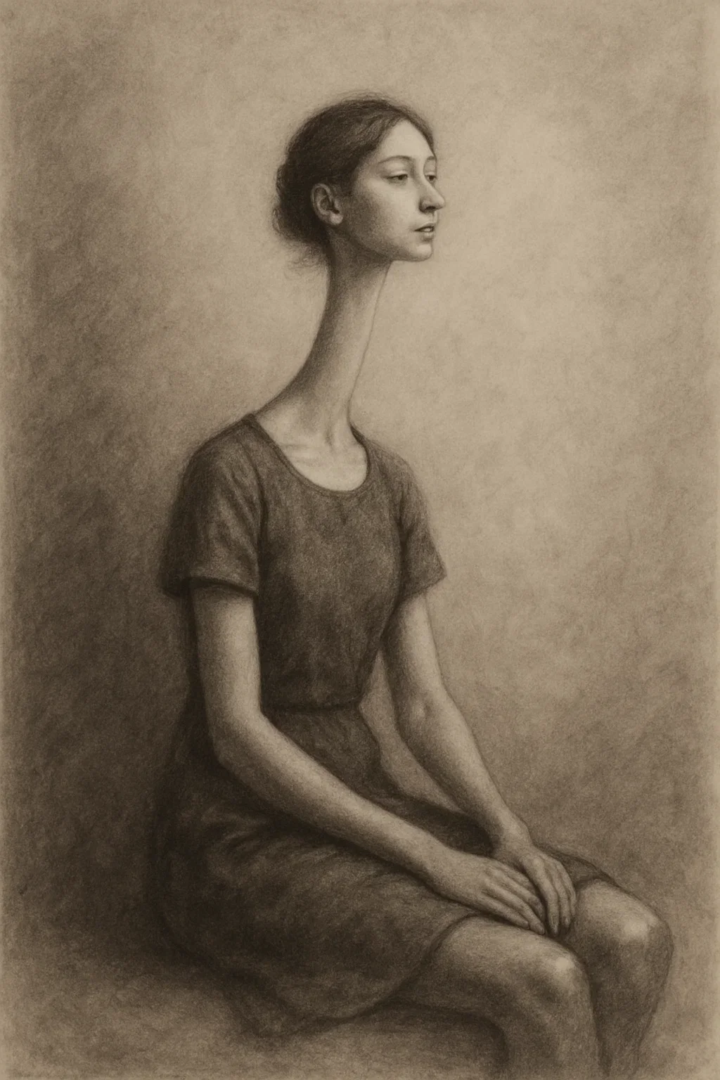 A charcoal drawing, soft diffused light. A female clothed figure in a neutral, relaxed pose. Seamless integration between body and any distortion; no seams or joins. Stretch the neck upward gradually so it lengthens more near the collar and less near the head; keep its width proportional and the jawline and shoulders coherent; leave the rest of the body unchanged. Maintain original thickness across the figure. Keep anatomy and proportions elsewhere. Material consistency: charcoal grain and tonal shading applied uniformly across the figure and the extended limb. Avoid grotesque enlargement; aim for graceful distortion with coherent volume and shadow.