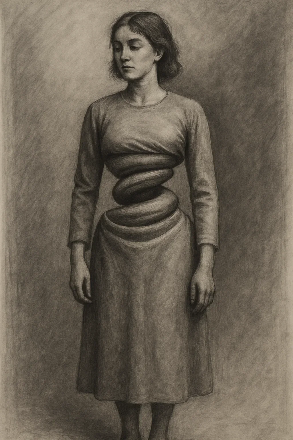A charcoal drawing of a clothed female figure in a neutral, relaxed pose. The figure's torso is a distinct, sculpted coil that spirals linking the bottom half of the body with the top. The coil is a piece of flexible form, with a taut, smooth surface and an internal, spiraling torsion. This coiled form is then placed onto the figure, maintaining its connection to the chest and hip. The entire composition should be a single, seamless image, with no visible seams or joints, where the organic body meets the spiraling, un-resolvable form.