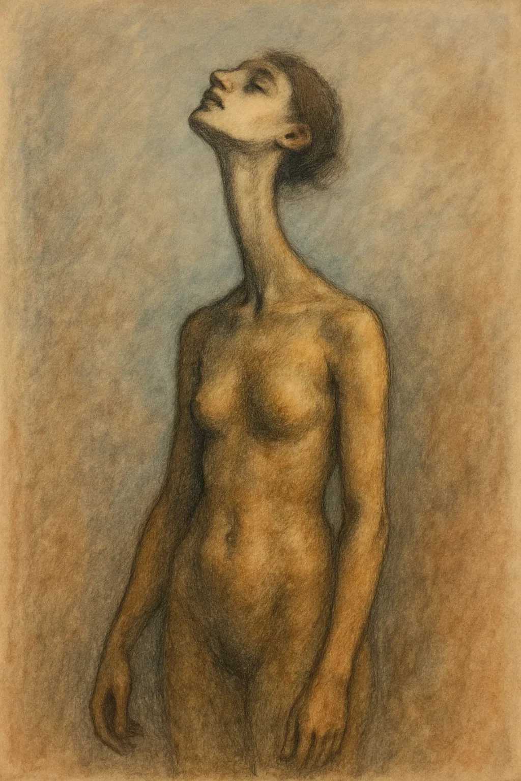 A pastel drawing of a female figure. Her body is in a neutral, relaxed pose, contrasting with her neck which is dramatically stretched towards the top of the frame. The elongated neck remains thin and in proportion to the rest of the body, creating a sense of graceful distortion rather than monstrous enlargement. The drawing uses soft, diffused lighting with subtle shadows, enhancing the charcoal texture and the figure's form without harsh lines. The overall style is expressive and slightly melancholic, highlighting the tension between the figure's contained body and the outstretched limb.