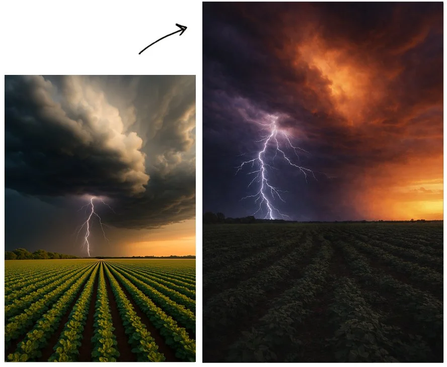 One image: coherent field geometry, stable perspective, consistent ground plane
