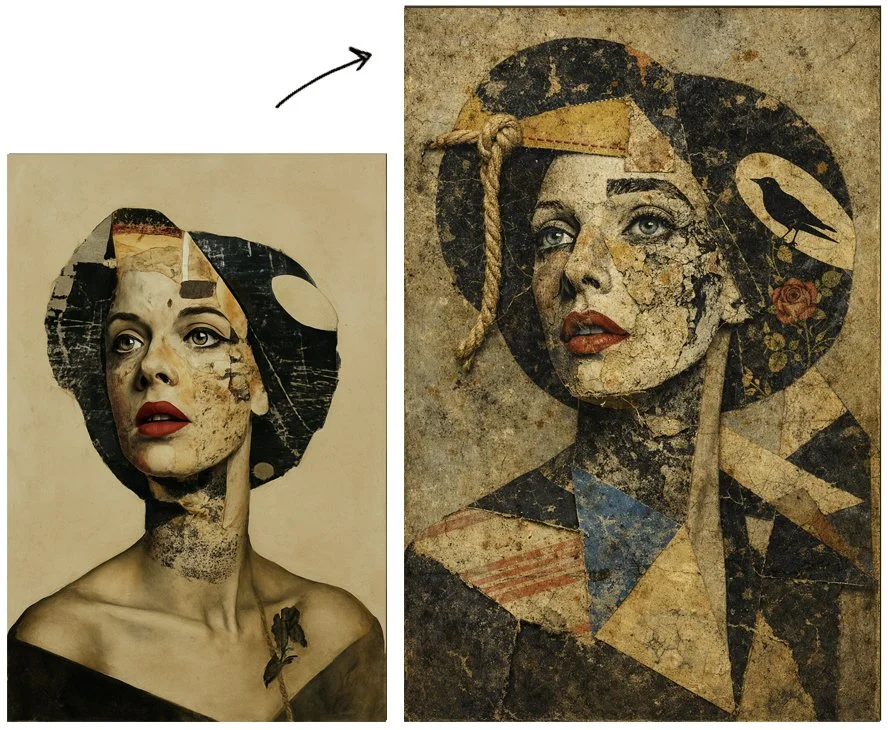 Image 1: Photorealism, aesthetic weight, performative sorrow. The girl is a subject, posed, costume-laden. The bird and cage are accessories and sadness is editorial.