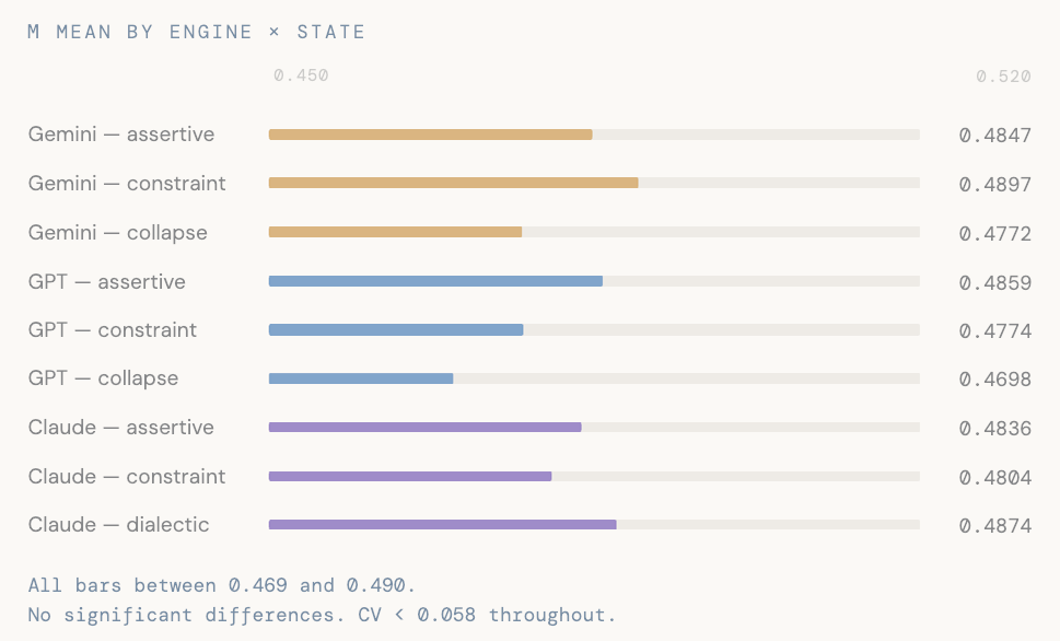 μ (cohesion) — the density of transition markers and reference pronouns — is structurally invariant across all three engines and all four rhetorical states. CV 0.046–0.057. All pairwise comparisons non-significant (all p > 0.14).