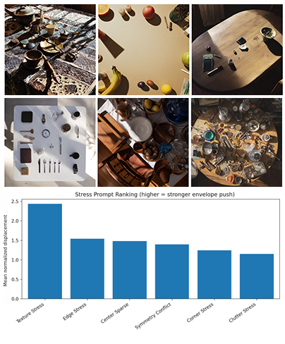 Strong spatial priors resist compositional reconfiguration through prompting alone. Users often attempt to “force” layout changes, encountering diminishing returns due to underlying geometric constraints. Measured envelope compression suggests practical compositional degrees of freedom are significantly narrower than semantic variation alone implies.