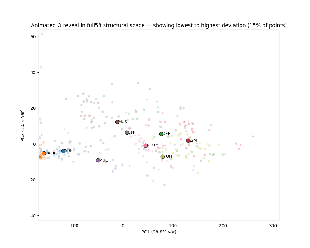 Ω is a continuous scalar — a distance, not a class. Multiple measurements over time produce a structural trajectory. Tissue drifting toward a pathological state shows increasing Ω before a defined diagnosis is possible. This is underexplored in computational pathology.