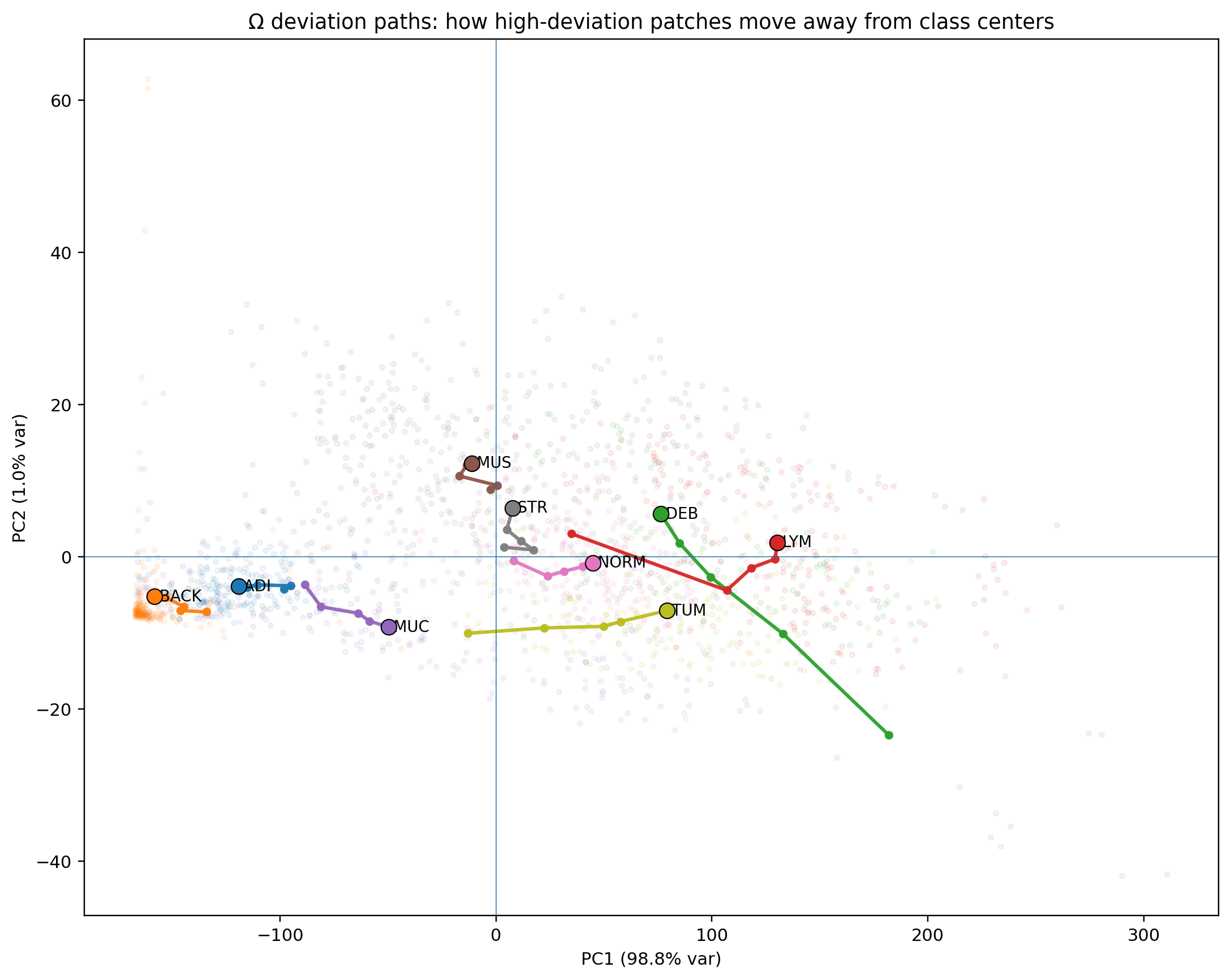 On CRC-VAL-HE-7K (1,800 Macenko-normalized 224px patches, 9 tissue classes), the system achieves 91.5% nine-class linear accuracy without any training, and produces visually confirmed structural separation between canonical and deviant patches across all seven clinical classes. A key finding is that deviant tumor patches stratify into two geometrically distinct failure modes corresponding to mucinous/necrotic differentiation and desmoplastic stromal reaction — detected through geometry alone.