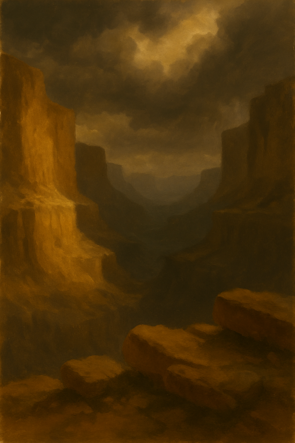 Foreground rocks → mid-dark tones (no detail, just volume)
