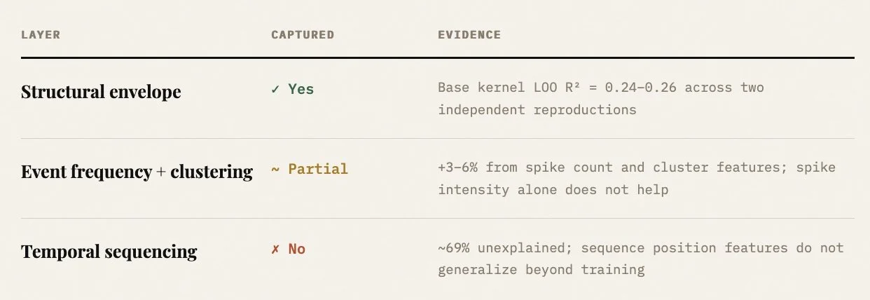The instrument is honest about what it can and cannot see. Surface structure recovers roughly a quarter of generation instability variance. The remaining 69% reflects temporal dynamics — spike timing, ordering, positional effects — that static structural measurement was not designed to capture.