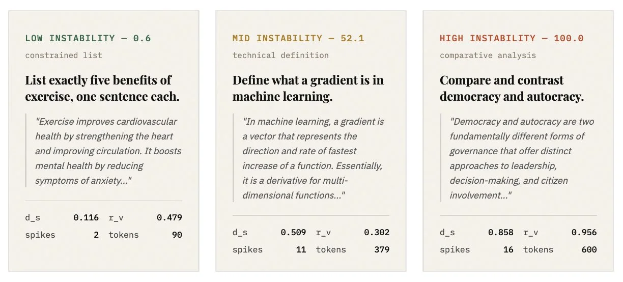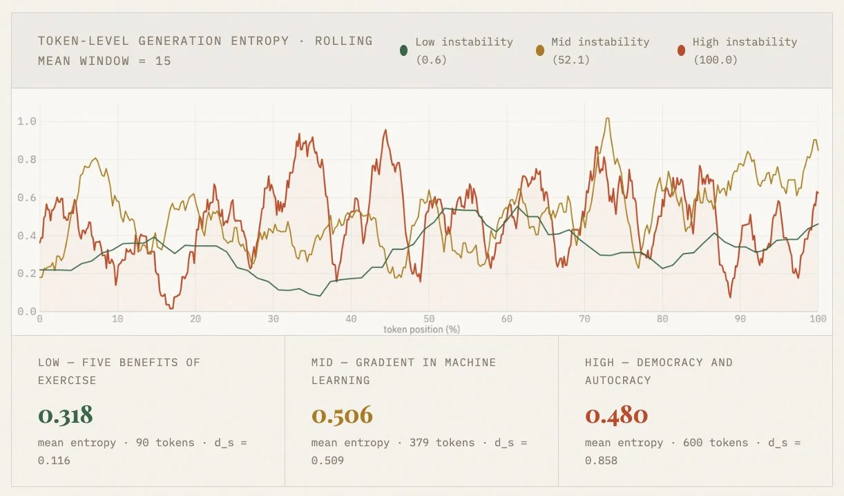 Note: mean entropy alone does not distinguish these responses (0.318, 0.506, 0.480 are similar in magnitude). The trajectory is the signal. The exercise list generates confidently from start to finish. The democracy response churns throughout — then drops sharply when generating structured headers, before climbing again into content. The structural measurements capture what mean entropy cannot.